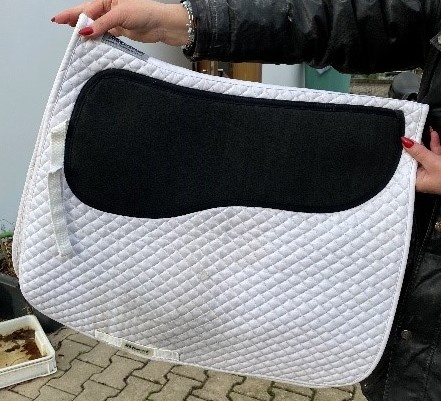 Bílá drezúrní dečka Equest ASP s tlumící pěnou našitou přímo na dečce, čímž je zabráněno nežádoucímu posouvání tlumící vrstvy. Vhodná pro koně citlivé nebo s vyšším kohoutkem.