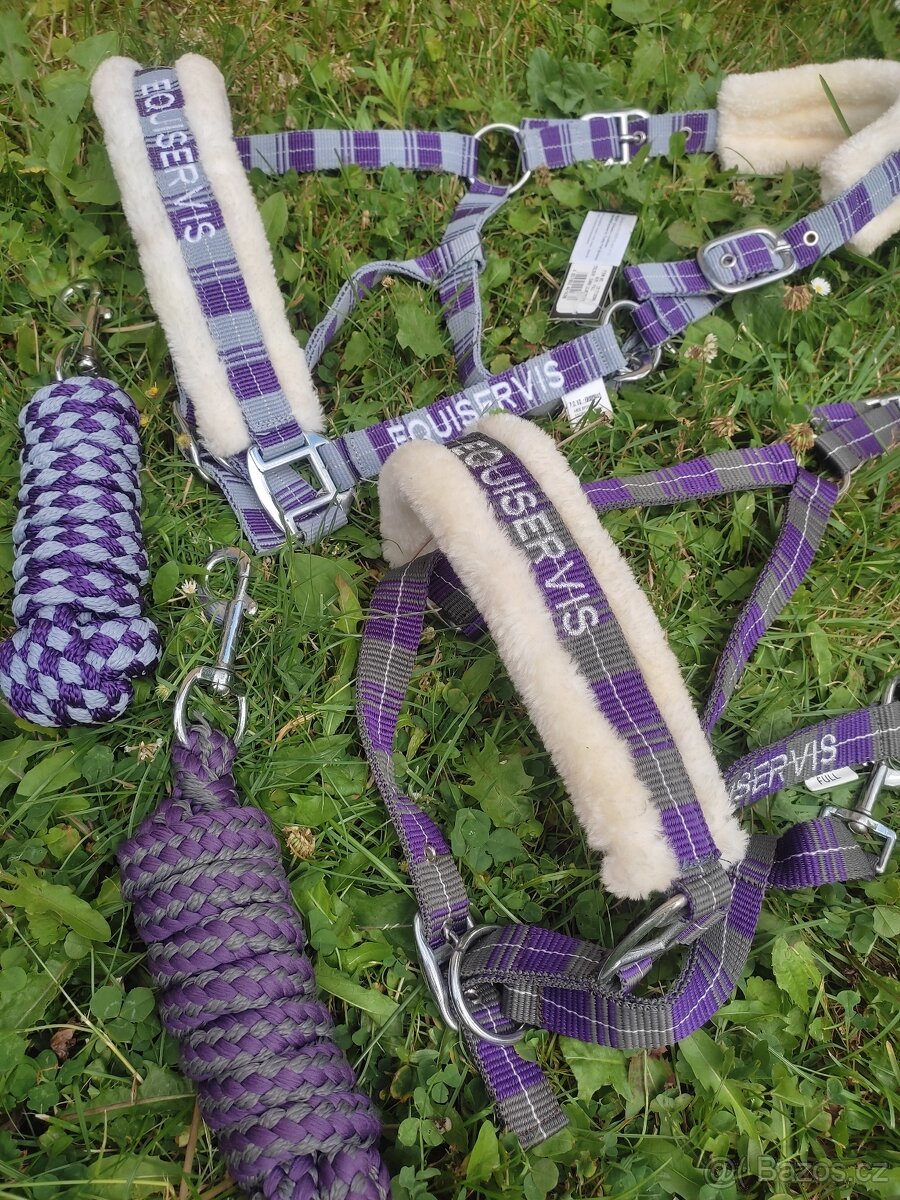Nabízím k prodeji tyto ohlávky podložené měkkým bílým beránkem. Barva světlejší a tmavší fialová. Nabízím jako kompletní sadu včetně ladícího vodítka v barvě. Úplně nové a cedulkama.