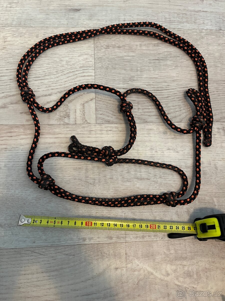 Černá ohlávka s červeným prošitím na uzlu je full (3) a je ze silnějšího lana (8 mm). Cena: 250 Kč.