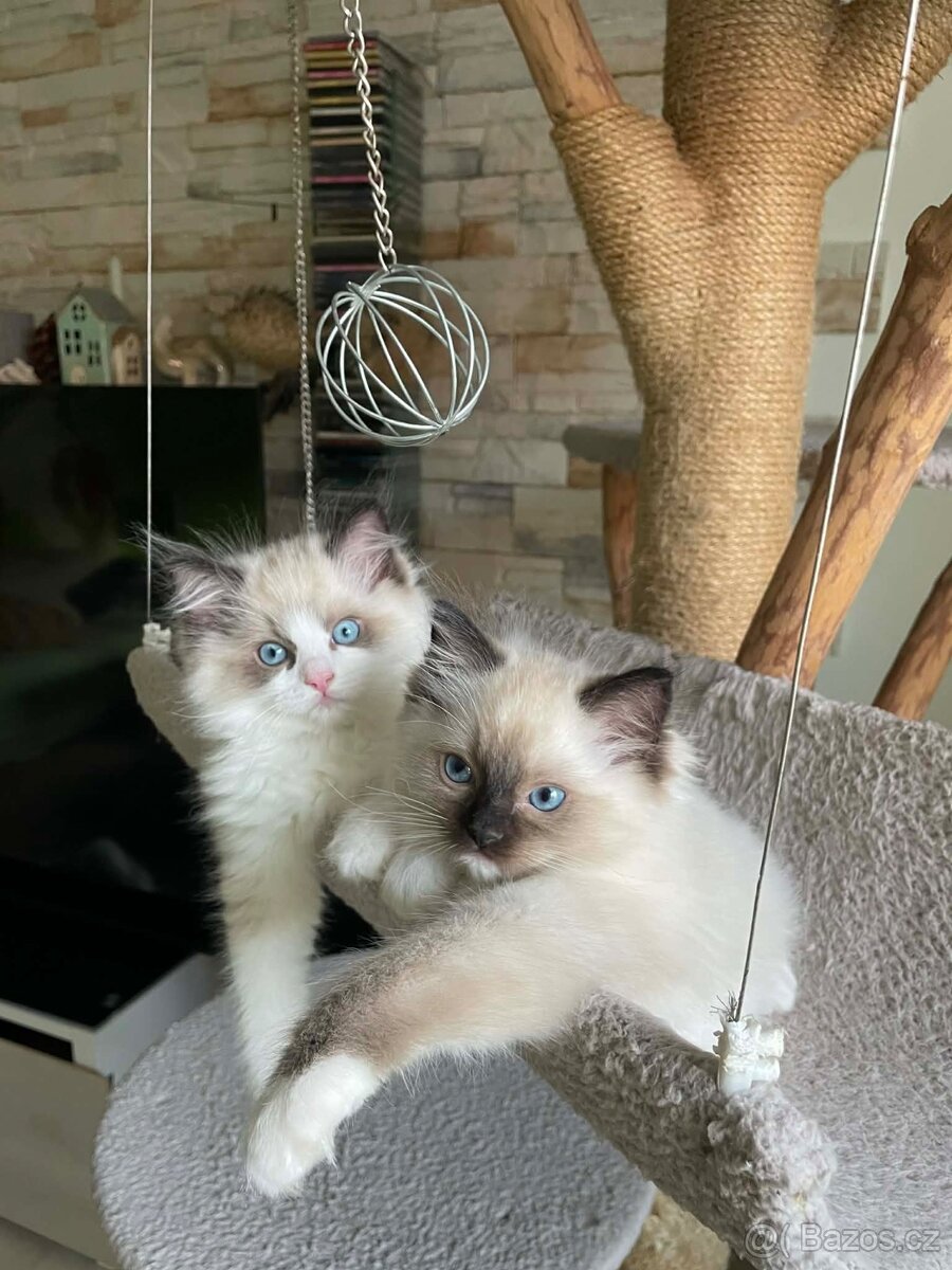 Nabízím k prodeji 2 čistokrevná koťátka Ragdoll bez PP - 2 kluci. Jsou narozená 09.10.2025, socializovaná a zvyknutá na jiné domácí mazlíčky.