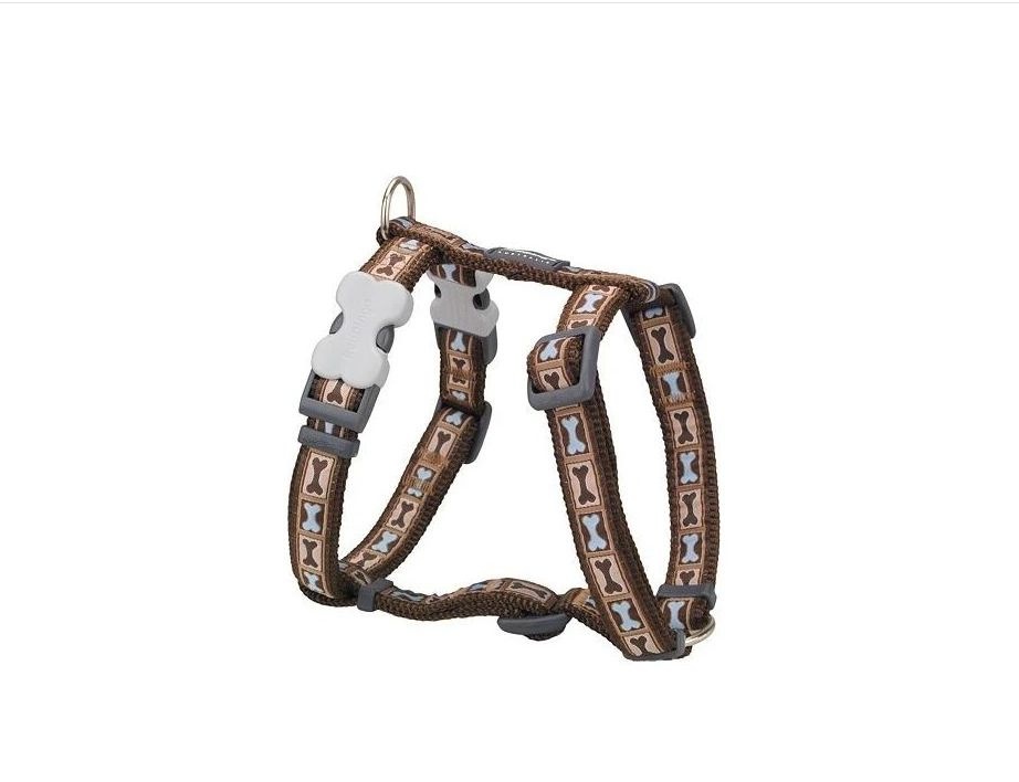 Postroje jsou vybaveny dvěma originálními plastovými sponami Bucklebone ve tvaru kosti pro snadné oblékání postroje.