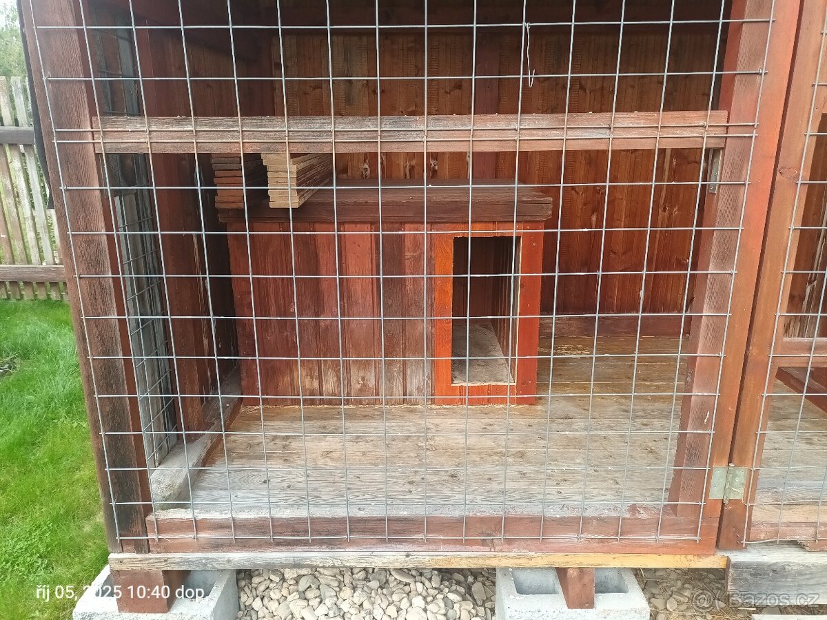 Prodám zateplenou boudu s předsíňkou a odnímatelnou střechou k tomu zdarma menší kotec pro psa (1,8 m x 2,5 m). Vše po chodském pejskovi cca 30 kg. Vhodné na velký oplocený pozemek. Kotec jsme nikdy nezavírali.