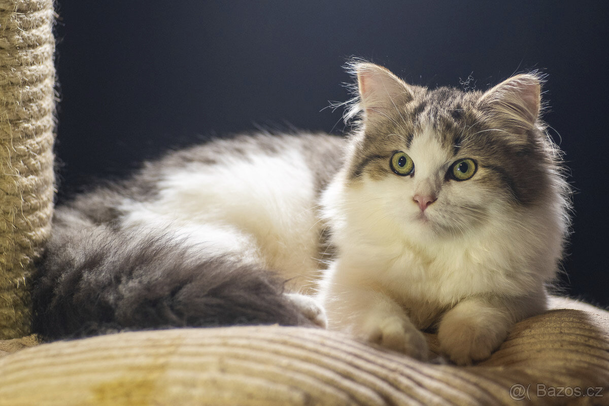 Sibiřská kočka - kočička s PP - TOP - [22.12. 2025]Chovatelská stanice nabízí krásnou sibiřskou kočičku s kresbou černozlatá tečkovaná s bílou. S velmi přítulnou a mazlivou povahou.