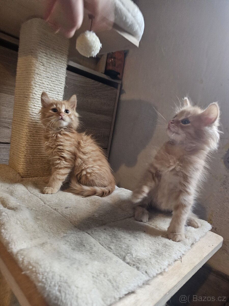K odběru doma odchovaná 3-měsíční sibiřská koťátka. Maminka kočka přírodně divoké zbarvení ( dlouhosrstá ale drobnější spíš polosibiřská ), tatínek dlouhosrstý sibiřský barevně přírodně modrá. Koťátka jsou pravidelně odčervovaná, zvyklá na kočičí wc a barevně jsou přírodně tmavá 2x zrzavá ( red zrzavé červený ryšavý zrzavý rezavý )