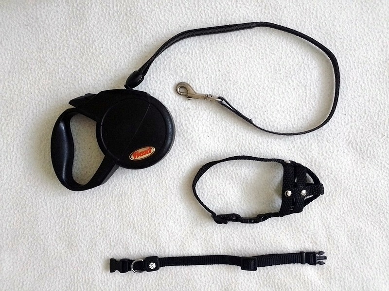 Za 170Kč nebo jednotlivě prodám černé samonavíjecí vodítko, délka lanka 5m, černý nastavitelný obojek z kvalitního pevného nylonu a náhubek se zapínáním na přezku.
