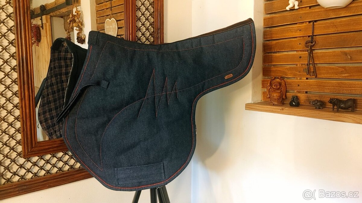 Podsedlova dečka / skoková. Materiál: denim/ vypln/ bavlna. Tvořím vždy jen jeden kus/ originál. Rozměry: delka 54cm, výška 50cm