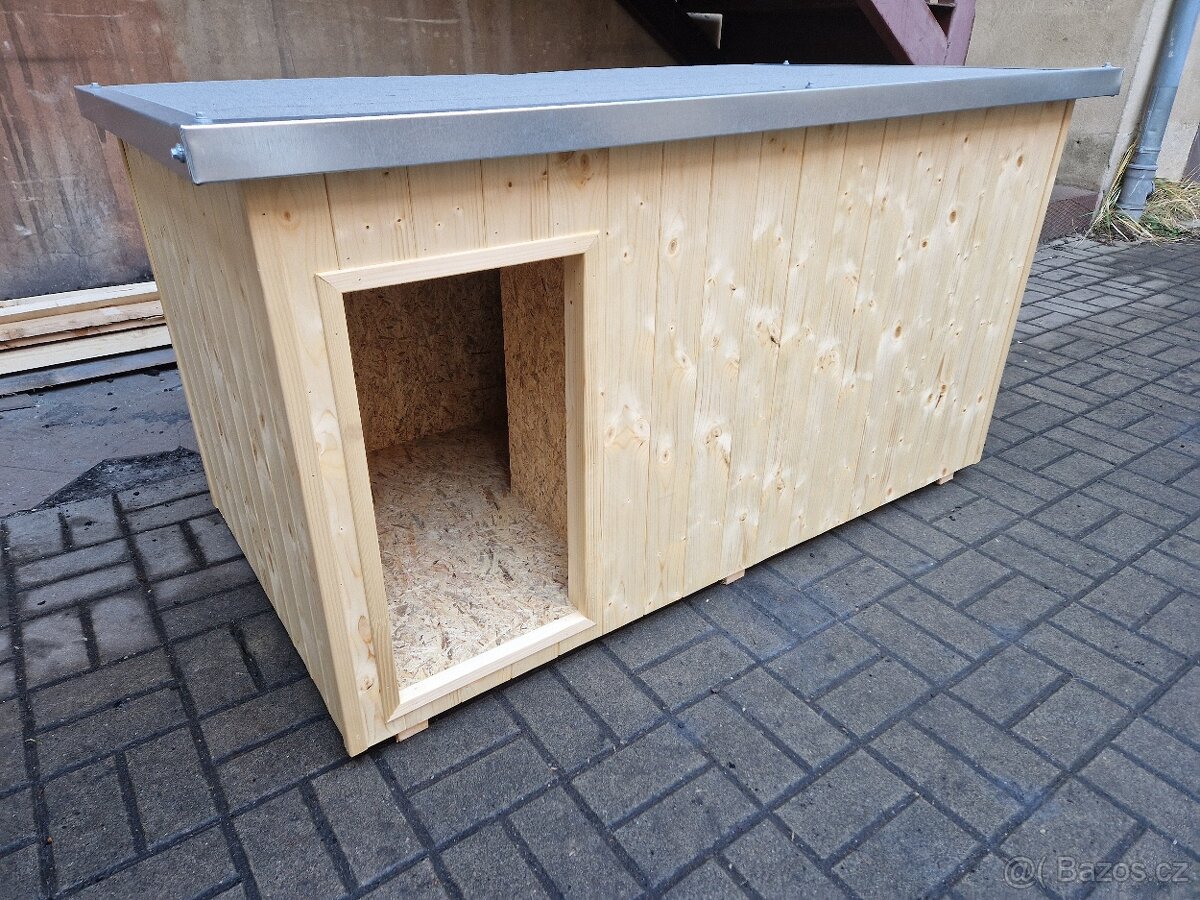 Zateplená bouda pro psa, venkovní rozměr 150×80×80cm vnitřní rozměr 140x70x70cm. Střecha je v mírném spádu, přesahuje z každé strany o 5cm, je pokrytá lepenkou, hrany jsou chráněny lištou z pozinkovaného plechu, rozměr je 160x90cm. Pro lepší přístup do vnitřního prostoru je možné ji celou sundat. Vnitřní část je z OSB desek + přepážka proti větru, kterou je možné vyndat. Venkovní část je z palubek, které jsou natřené bezbarvou lazurou. Celkově je bouda kompletně zateplená minerální izolací, podlaha, stěny i strop. Síla všech vrstev (tloušťka stěny) je 5,5cm (palubka, minerální izolace, OSB). Velikost vlezu boudy je 60x32cm, váha boudy je cca 70kg.