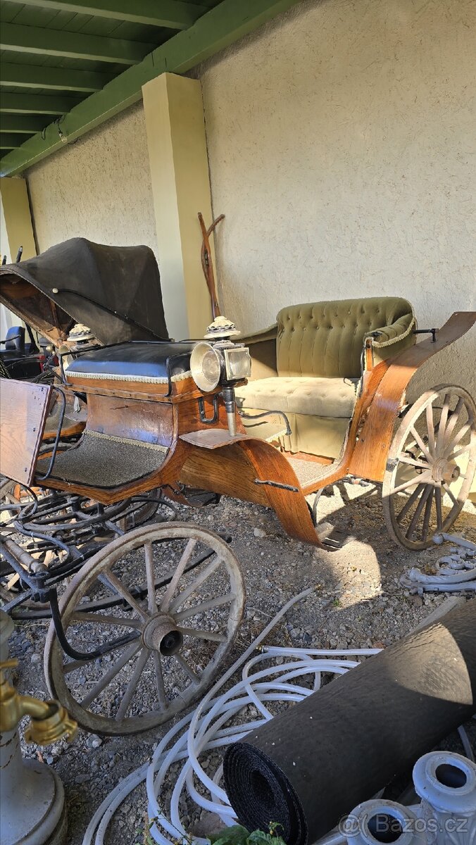 Prodám kočár typu mylord. Kočár byl do šroubku rozebraný, veškeré kovové díly nalakované a dřevo bylo opraveno truhlářem, zvláště blatníky, které byly dost zničené. Takže to by mělo sloužit po dlouhá léta! Je potřeba udělat nová kola či tyto opravit, na nějakou tu vyjížďku to ještě vydrží, ale do budoucna by bylo fajn udělat i kola. Je potřeba udělat oje, nejsou ke kočáru. Lze si tedy udělat jak pro jednospřeží, tak dvojspřeží. Na kočáru se nedochovala střecha, takže je bez ní, avšak na vyjížďky poslouží jako ostatní bryčky bez střech. Čalounění je dělané zeleným sametem. Kozlík má černou koženku. Lampy nejsou součástí kočáru, patří k jinému. Mám ještě další dva kočáry a jezdím jen s jedním, proto může tento dělat radost jinde. Byl opravený poctivě, ale nemá zde využití.