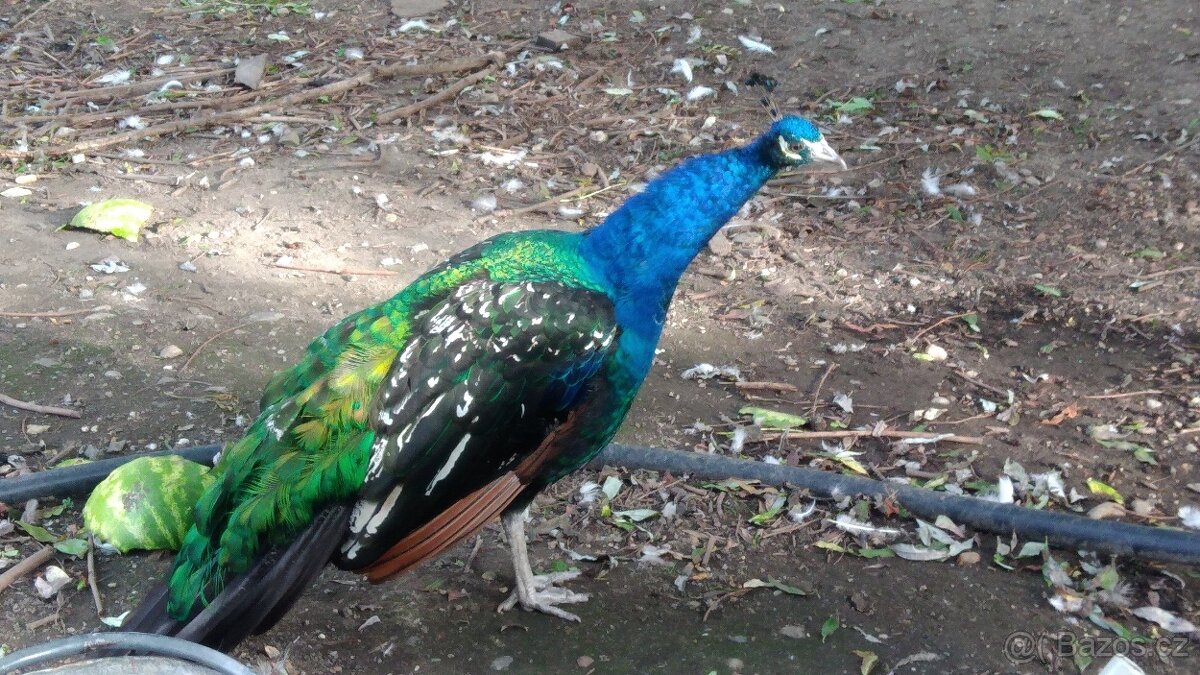 tříleté modré pávy 3500 Kč/ks, černokřídlé 4000,