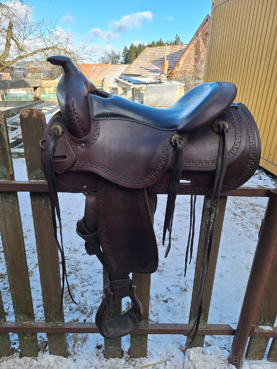 Prodám kvalitní kožené westernové sedlo velikost podsedlí 16" . Vhodné pro kratšího koně. Rozměry viz foto. Cena 18 000kč (rychlé jednání = sleva) Zasílám balíkovnou, poštovné předem na účet, zbytek dobírka či převod. V případě zájmu dofotím, doměřím.