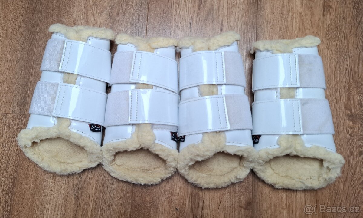 Prodám bílé lesklé drezurní kamaše na přední i zadní nohy ve velikosti pony. Kamaše jsou v hezkém stavu, byly používané jen na opracování a dekorování.
