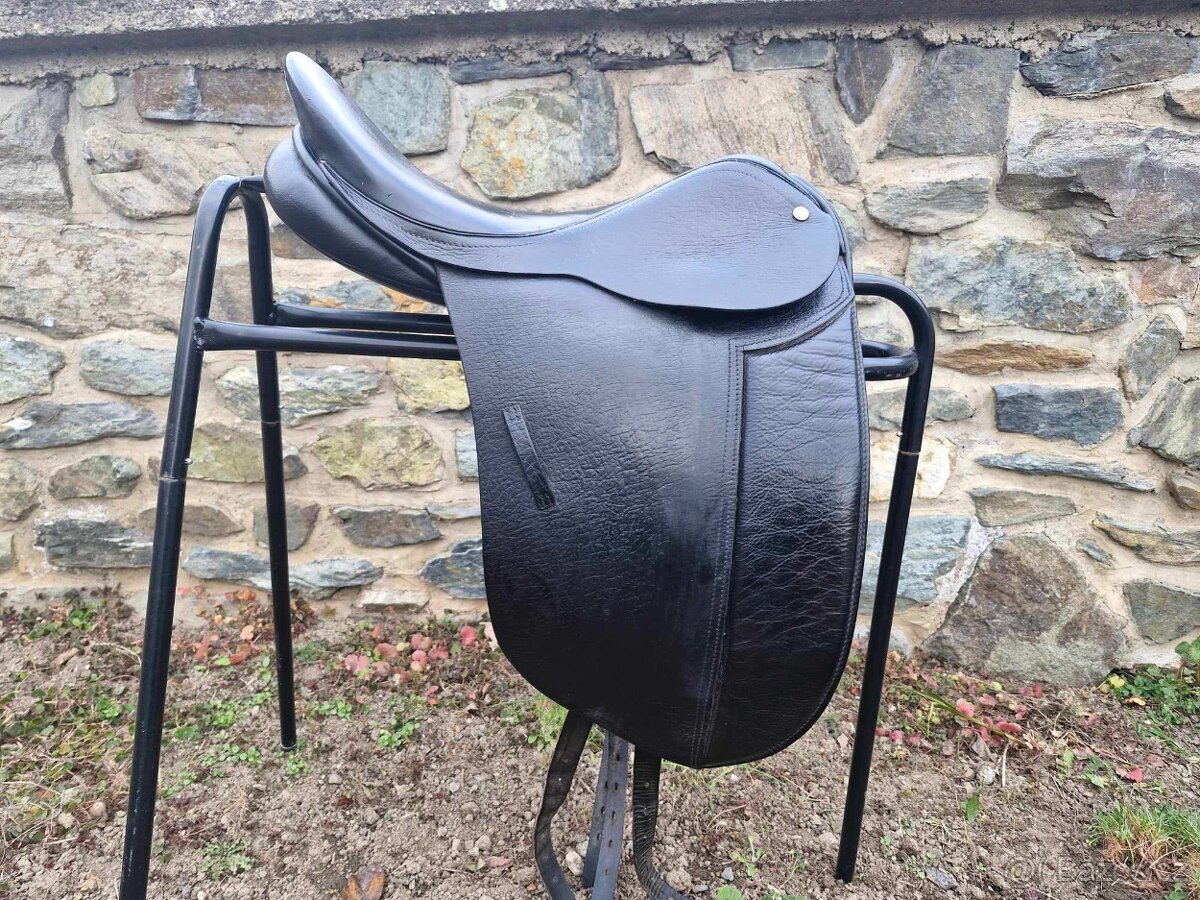 Nabízím k prodeji černé drezurní sedlo bez výrazných kolenních opěrek. Vyrobené v Británii. Starší sedlo, měkké vlněné polštáře. Posedlí odpovídá 17", šířka komory M.