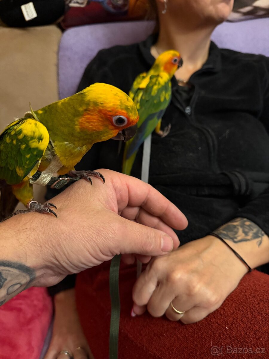 Prodáme ručně dokrmené Aratingy. Jeden sameček a dvě samičky. Mají test DNA a učíme je na kšíry. Odběr v Hostivici u Prahy. 603476887