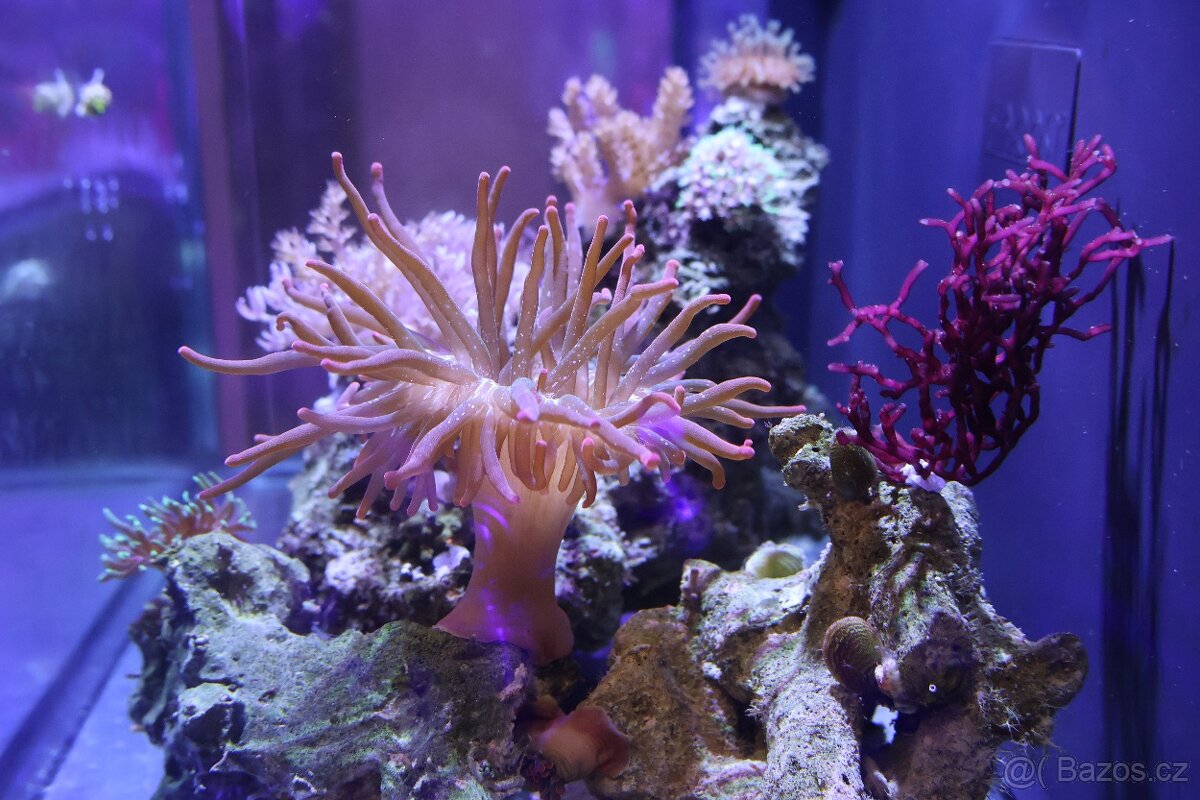 Součástí je kompletní, již zaběhnutý život: dominantní korálový kámen se sasankami, pár klaunů Ocellaris (Nemo), kteří je běžně obývají, pulzující Xenie a další drobní mořští živočichové. Technika zahrnuje akvárium s integrovanou filtrací, profesionální LED osvětlení, odpěňovač, čerpadlo, topítko a další potřebné vybavení. Prodávám kompletní sestavu tak, jak je na fotografiích.