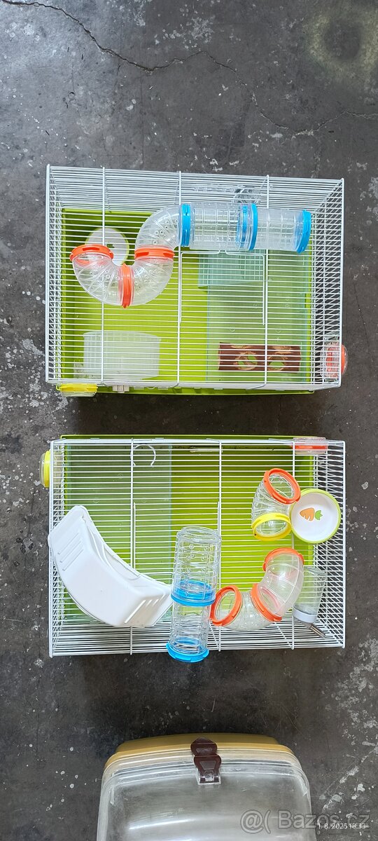 Použitá klec na křečky 2 ks. Klece jdou propojit tunelem. Plus příslušenství.