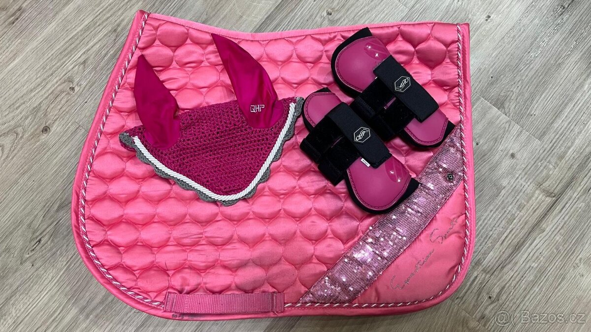Prodám krásnou růžovou sadu na poníka od QHP. V sadě je podsedlová dečka z rychle schnoucího materiálu, šlachovky a čabraka. Vše ve velikosti PONY. Sada je používaná, ale v super stavu. Reálná barva podsedlovky je viz.první foto. Prodám jen jako celek. Cena 1500,-