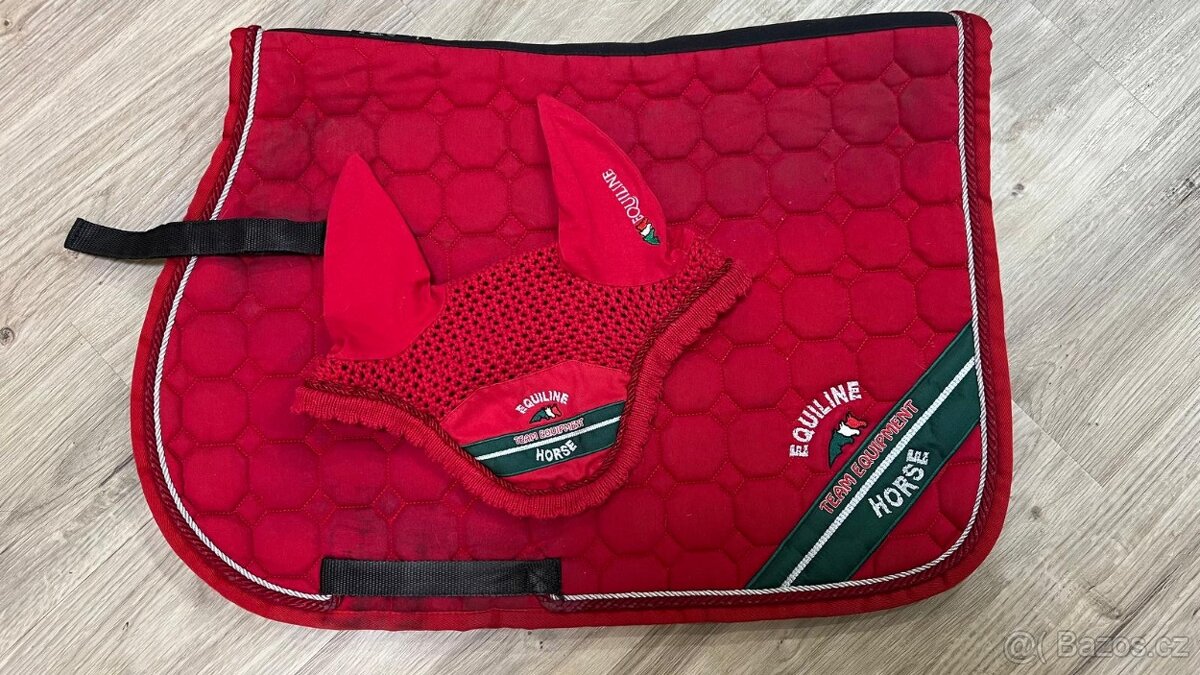 Prodám krásnou, červenou sadu od značky Equiline v TOP stavu. V sadě je podsedlová dečka a čabraka, obojí je velikost COB.