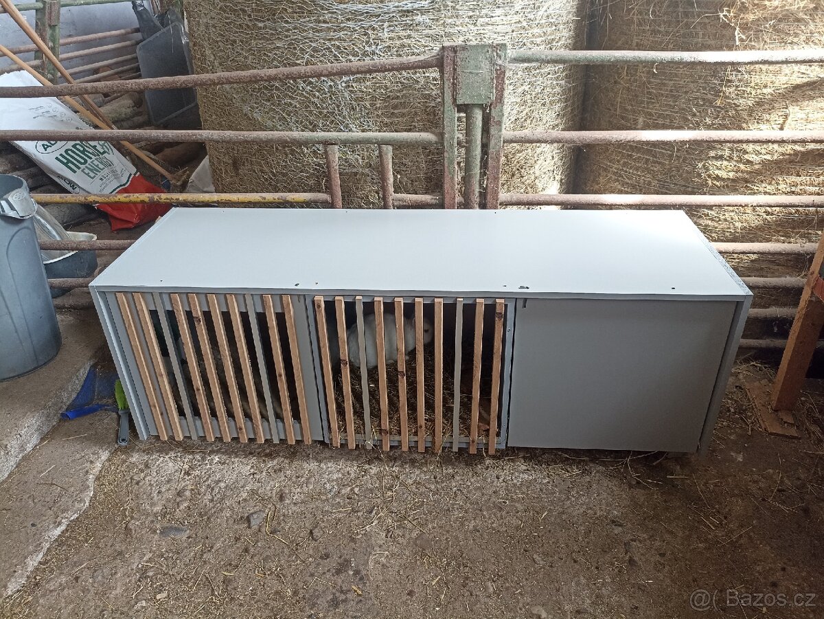 králíkárna. Plechové dno, pro lepší čištění. Délka 155 výška 50. Lze přepažit. Držák na napáječku. Dvoje otevírací dvířka.