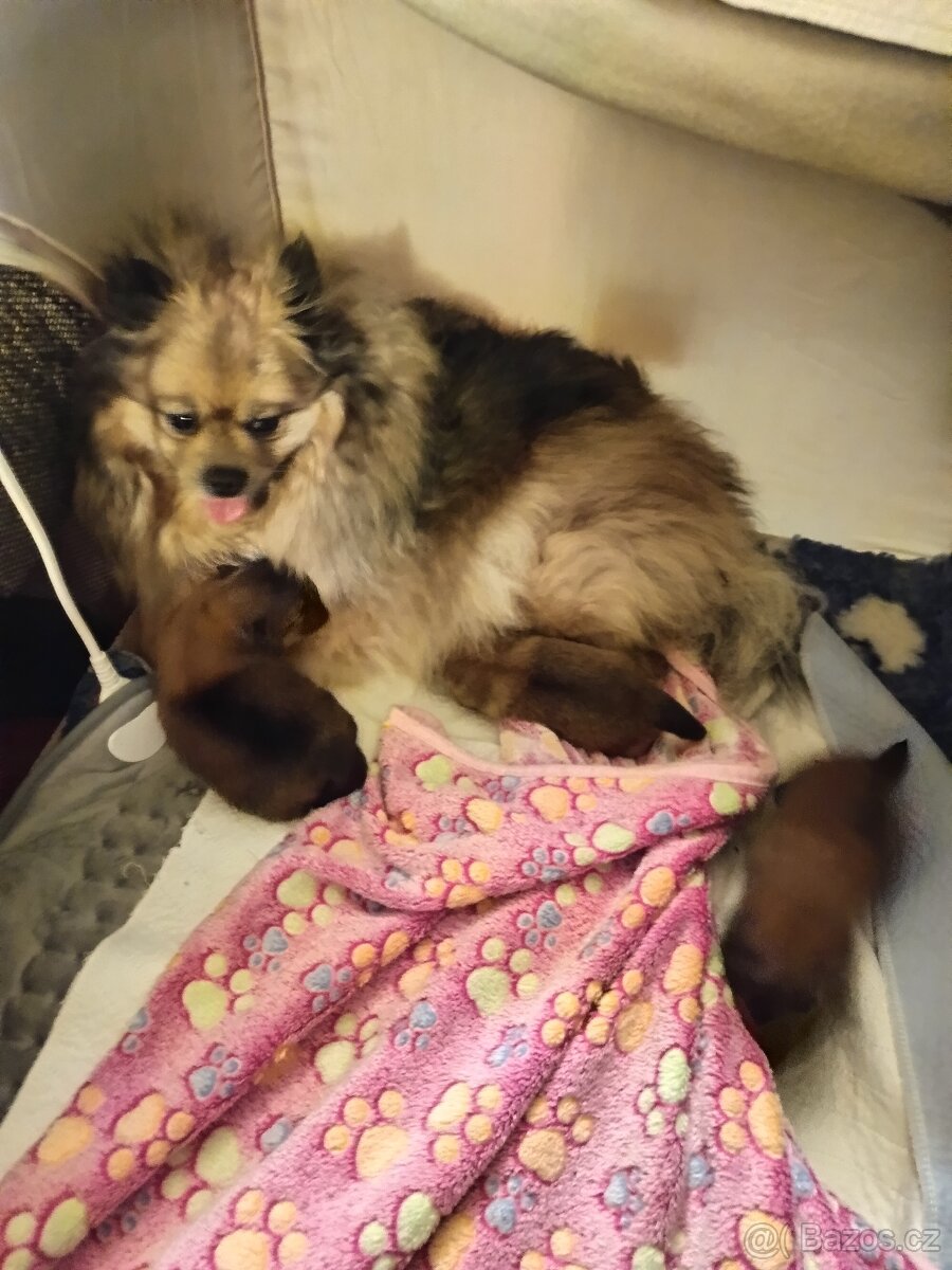 Štěně Pomeranian (trpasličí německý špic) - [12.2. 2026]Prodám 4 měsíční štěně Pomeranian bez pp.Je to malí,inteligentní a společenský pes z bohatou srstí a liščím výrazem.Hmotnost se pohybuje mezi 1,8–3,5 kg, výška do 22 cm.Miluje děti..Dám mu sebou pár příslušenství (vodítko,granulky,misky...)Pro více i ...