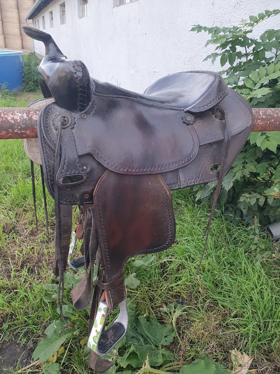 Westernové sedlo Zajac vhodné pro střední krátké koně, bohužel nám už užší. Rozměry - delka 62cm, posedlí 39cm, šířka mezi conchi 17,5cm. Třmeny jsou zkrácený, aby sedeli 8 i dítěti od 8 let, takže se na něm muze střídat dospělí s dítětem. Prodávám s koženými třmeny v barvě sedla. Nese normální znaky ježdění, žádné vady.