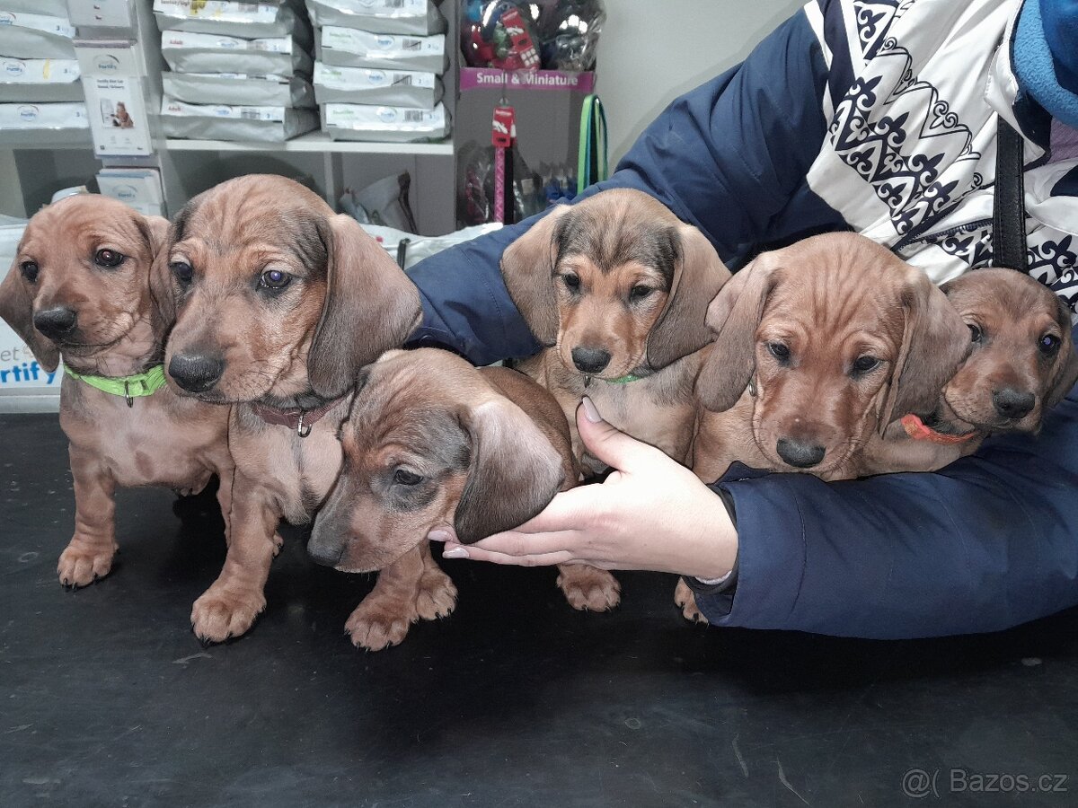 Jezevčík bez PP. Vymazlená štěňátka jsou odčervená, očkovaná a čipovaná, očkovací průkaz. Jen volat. Narozena 24.11 2025 , Odběr ihned. Jen pejsci. Poslušní, chodí na podložku.