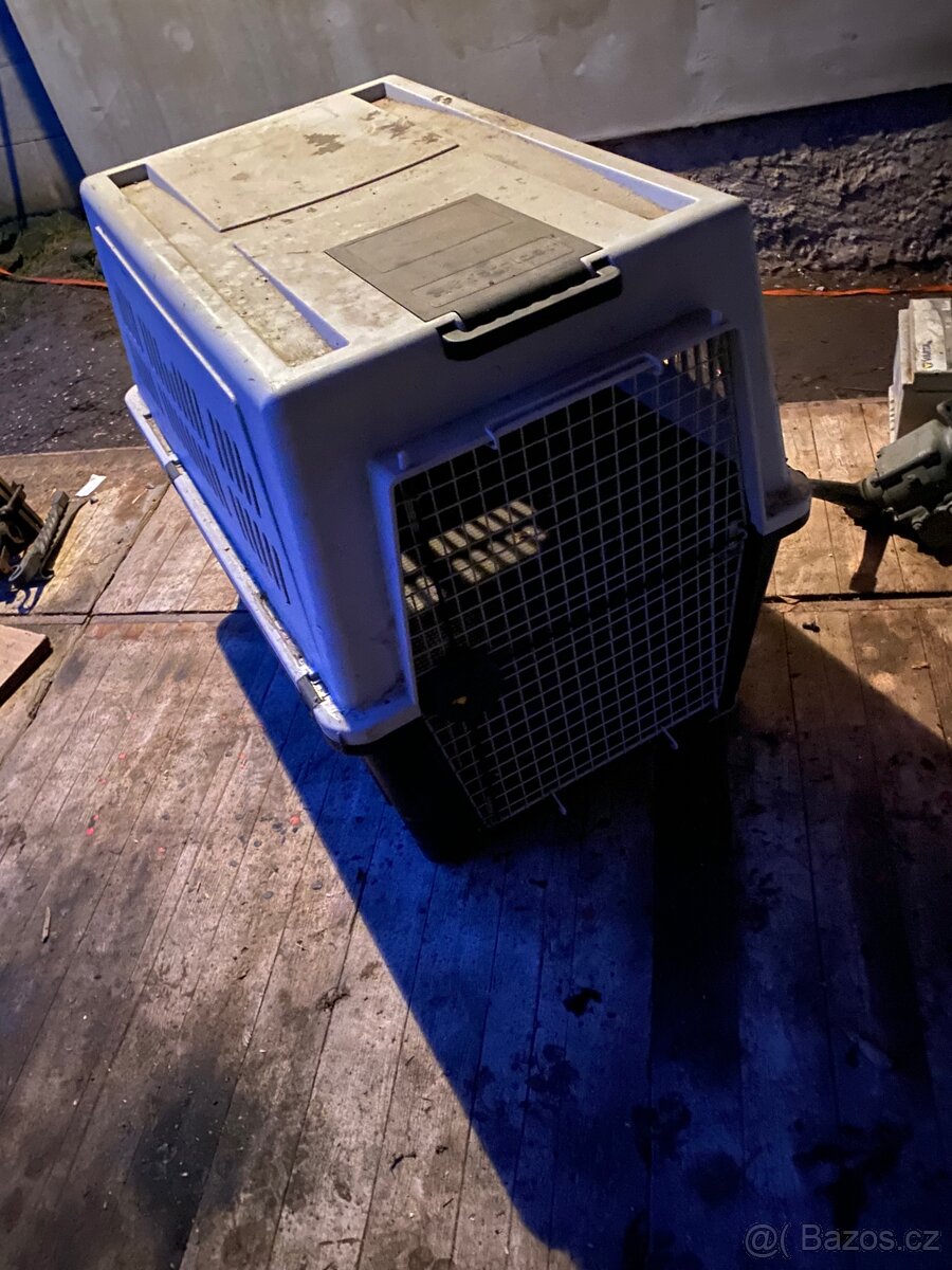 Plastový přepravní box na střední plemeno psa, opravováná, ale na funkčnost nemá vliv.
