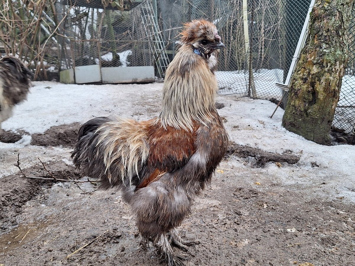 Hedvábnička velká, už jen 3 mladí srpnový barevní kohouti za čokoládu.