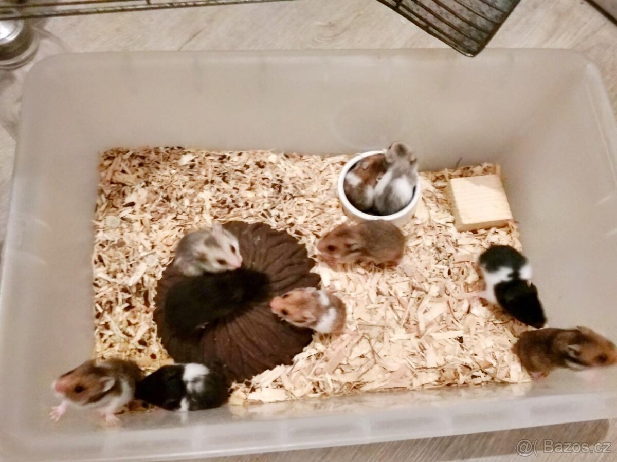 Mláďata křečka syrského/zlatého, zvyklá na manipulaci, samci i samice, různé barvy. Odběr Praha nebo Český Brod. Cena dle zbarvení.
