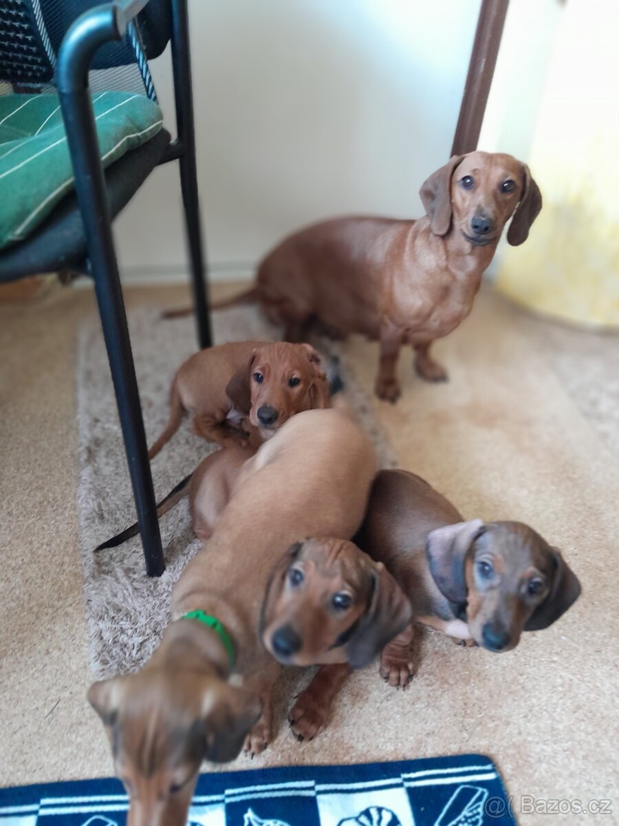 Jezevčík hladkosrstý trpasličí - [1.2. 2026]Vymazlena štěňátka červených trpasličích hladkosrstych jezevčíků. Rodinná tradice chovu přes 70 roků. Dobrým lidem, kteří mají jezevčíčky rádi pro jejich inteligenci a svéráznou povahu.