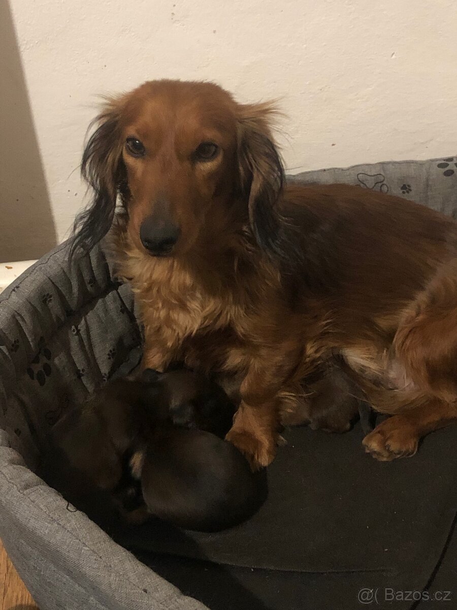 Jezevčík trpasličí dlouhosrstý - [2.2. 2026]Nabízíme dva pejsky trpasličího dlouhosrstého jezevčíka. Štěňátka jsou očkovaná, odčervená a již připravena k odchodu do nového domova. Na posledním foto maminka.