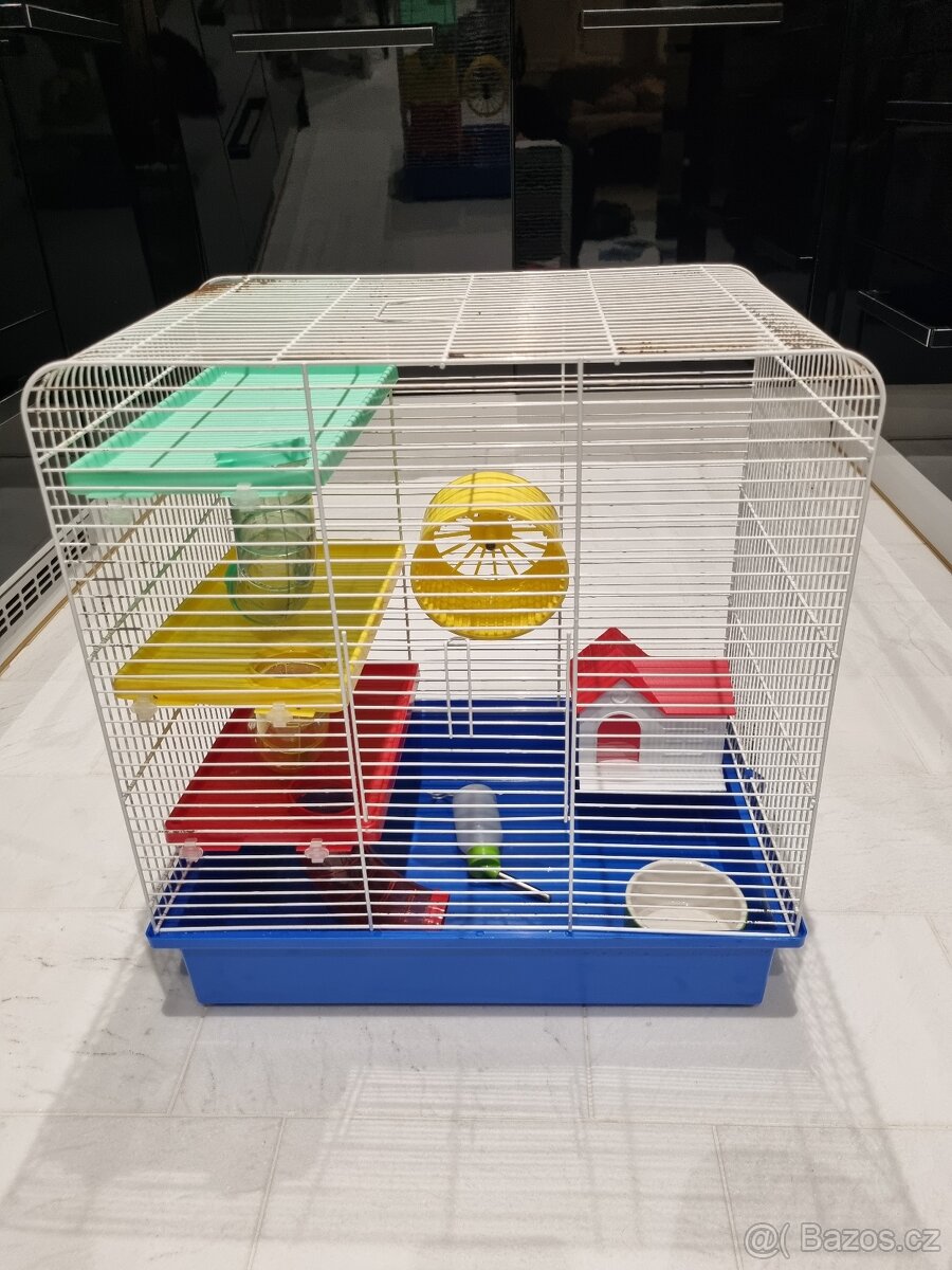 Prodám použitou klec po 1 křečkovi. Součástí vybavení je kolotoč, domeček, keramická miska, pítko, police s tunely.