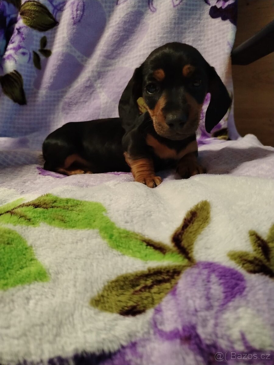 Jezevčík - [11.2. 2026]Nabízím 8 týdenní štěňátka hladkosrsta trpasličí kluky a fenu jsou očkovaná mikrocip s kupní smlouvou a balíčkem dobrot.