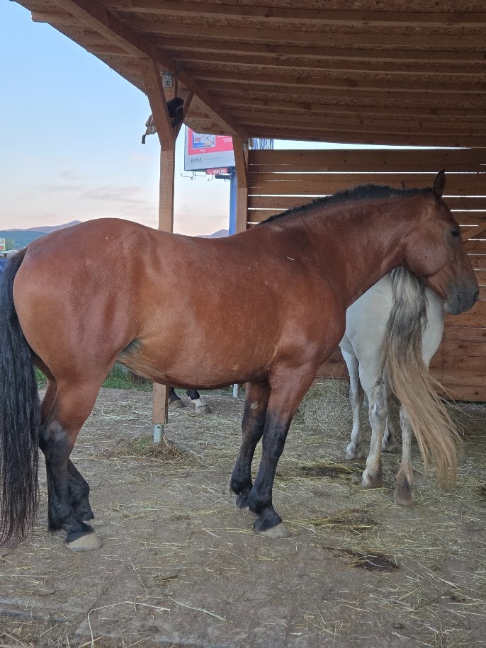 Hľadám ten najlepší nový domov pre kobylu, 7 rokov, kríženec muránsky norik a teplokrvník. Vysoká cca 165 cm. Kobyla je prijazdená, jazdená len rekreačne. Veľmi jemná, vnímavá, ochotná. Svojho ľudského parťaka nesklame. Nie je vhodná pre začiatočníka. Zdravá, kopytá robené pravidelne, bosá. Na vychádzky ide aj sama bez koní. Rešpektuje elektrický ohradník. Režim 24/7, seno nonstop.