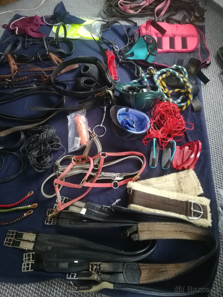 Z důvodu ukončení prodám mix věcí. Více informací přes WhatsApp. Při odběru všeho platím poštovné a zdarma přidám modrou podsedlovku s lonžkou a ohlávkou bez karabiny,viz. poslední foto. Cena za vše na fotografiích 7500 Kč. ( uzdečky, ohlávky, nové hnědé gumové otěže, udidlo,neoprénové zvony, matrtingal, gumový šambon, vazáky, helmy, přepravní chrániče v top stavu, podsedlovka s beránkem, nové barevné čelenky, podbřišníky- anatomický kožený v top stavu, sítě na seno, čabraky na uši).Trasa Aš-Cheb mohu při odběru všech věcí zdarma dovézt.