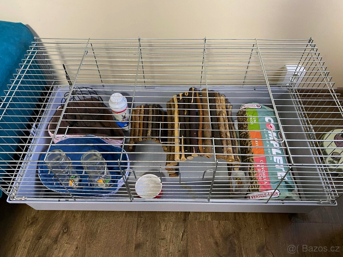 Součástí ceny jsou 2 dřevěně rampy, které se dají polohovat například do tvaru domečku, miska na krmivo, 2 funkční napáječky, závěsná klec na seno, 2 pelíšky (lehce potrhané od pračky a sušičky), zbytek krmiva Verse Laga a letní květinové směsky pro morčata a Odour Killer.