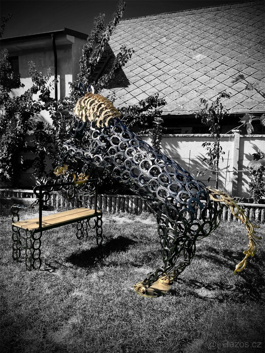 Představ si majestátního koně z stovek podkov, ručně vytvořeného s pečlivostí, jak se vzpíná u lavičky, která ladí do posledního detailu.