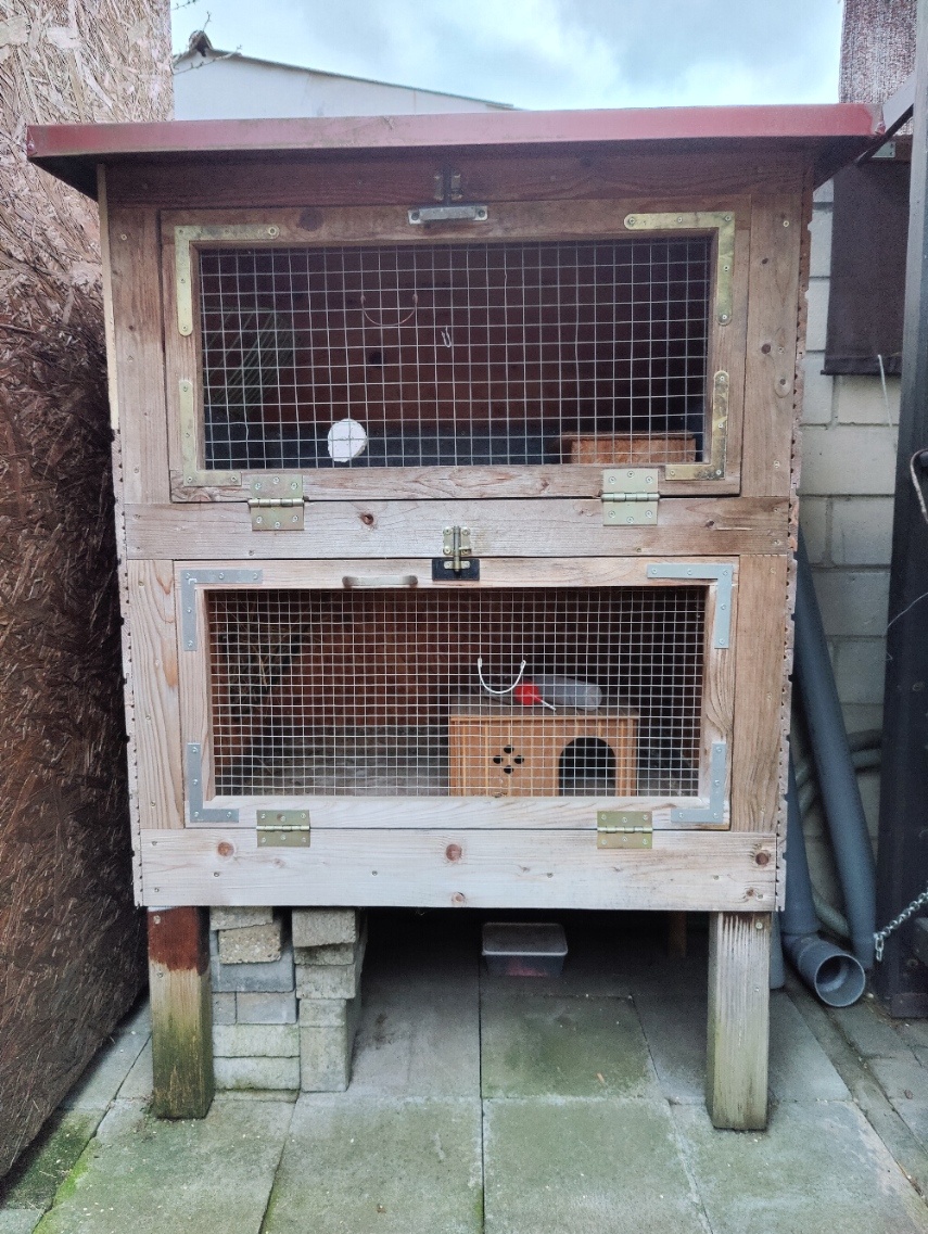 Nabízím malou venkovní králíkárnu/morčatárnu s dvěma kotci a plechovou střechou. Výška je cca 160, šířka 100 a hloubka 60 cm. Stříška je trochu větší. Uvnitř jsou plastové vaničky a krmítka na seno. Byla používána cca 5 let pro 2 morčata, ale je celkově v dobrém stavu.