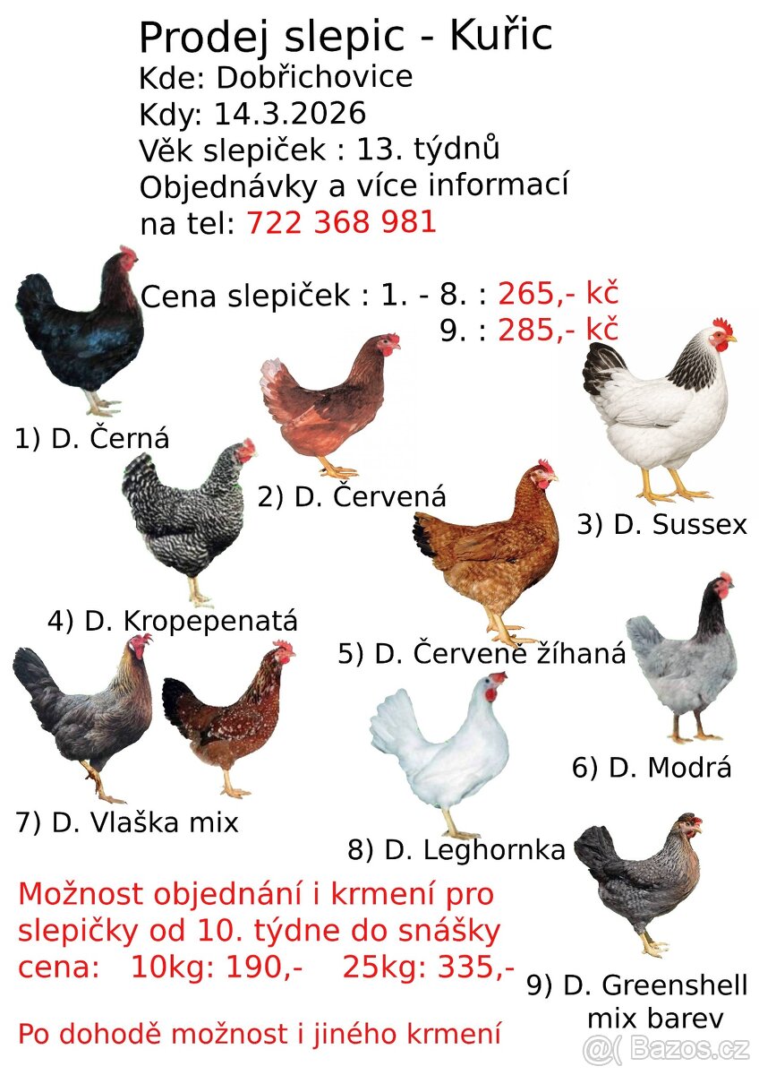 Nabízím mladé kuřice. Stář 13 týdnů Zbarvení dominant hnědý, černý, kropenatá, červeně žíhaná, sussex, modrá vlaška mix, leqhornka bílá. Cena 265kč/kus a greenshell mix barev za 285kč/kus. Slepičky jsou plně vakcinované. Odběr bude možný 14.března 2026. Objednavky do 12.3.2026. Dale nabízím krmnou směs 10kg za 190kč a 25kg za 335 kč a další chov. potřeby pro drůbež