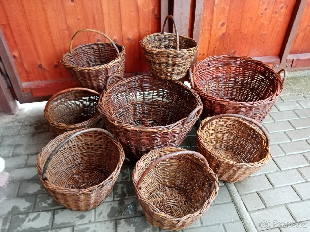 Prodám tyto proutěné koše, košíky na brambory, houby a seno. Jednoušák 200,-Kč za kus, dvouušák 250,-Kč. Při odběru všech najednou 100,-Kč sleva na cestu. Košíky nejsou nové, ale minimálně používané a zachovalé. V případě zájmu by bylo možné malé i poslat, velké nejspíše osobní odběr. Zaslání je možné vzhledem ke špatným zkušenostem pouze po předchozí platbě na účet. Na dobírku nezasílám. Bližší informace na telefonu nebo emailu. Na SMS nereaguji. Pokud inzerát čtete, tak je aktuální.
