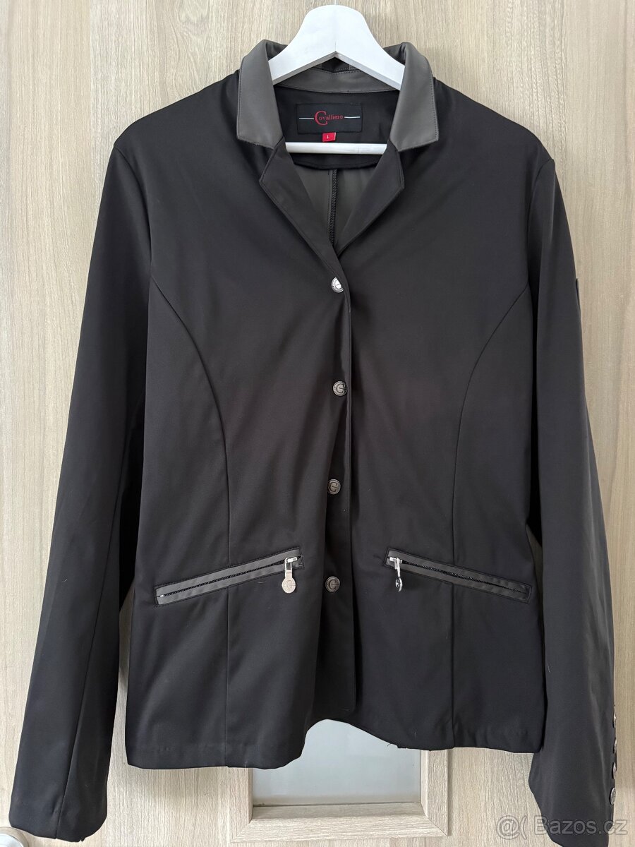 Jezdecké černé sako, vpředu 4 knoflíky, dvě přední funkční kapsy, antracitový límeček,dva zadní rozparky, materiál bezúdržbový (rychle schne, stačí po závodech otřít vlhkým hadříkem) velikost L, cena 800,- Kč včetně poštovného.
