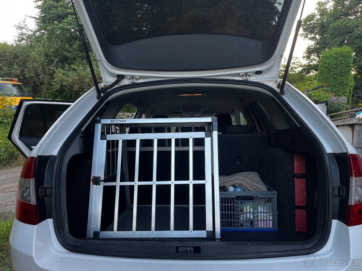 Prodám přepravní klec pro psa do auta značky Bestpet velikost M (rozměry 81x65x66 cm) s gumovou protiskluzovou rohoží. Klec má zkosenou zadní stranu, aby lépe pasovala za zadní sedačky. Vhodná spíše pro auta typu kombi (hlouba 81 cm). Klec je vyrobena z hliníkových profilů a MDF desek černé barvy. Používala jsem na border kólii.