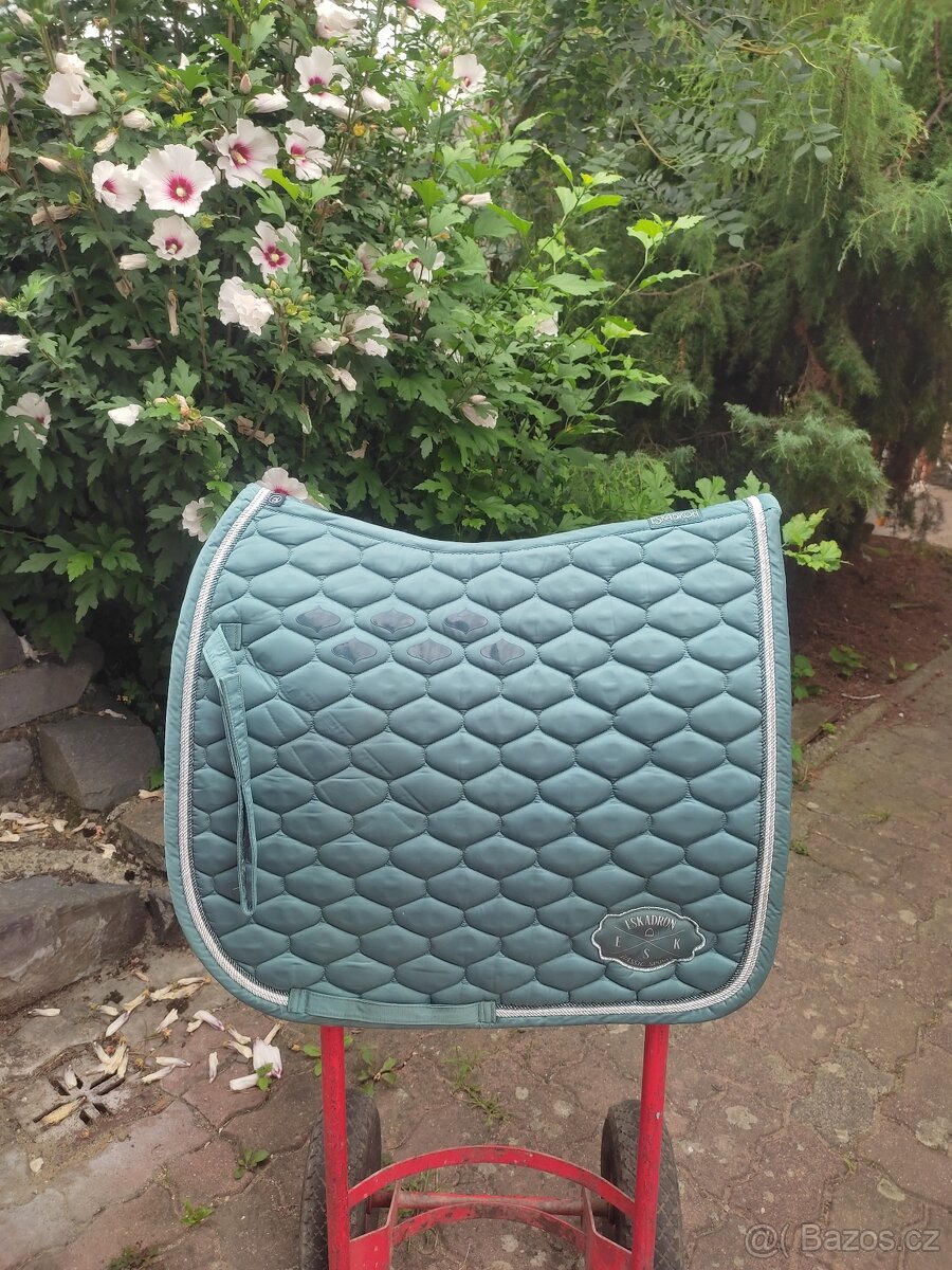 1. Zelená drezurní Eskadron dečka, zajímavé prošití, v reálu moc hezká barva, za 1600,-