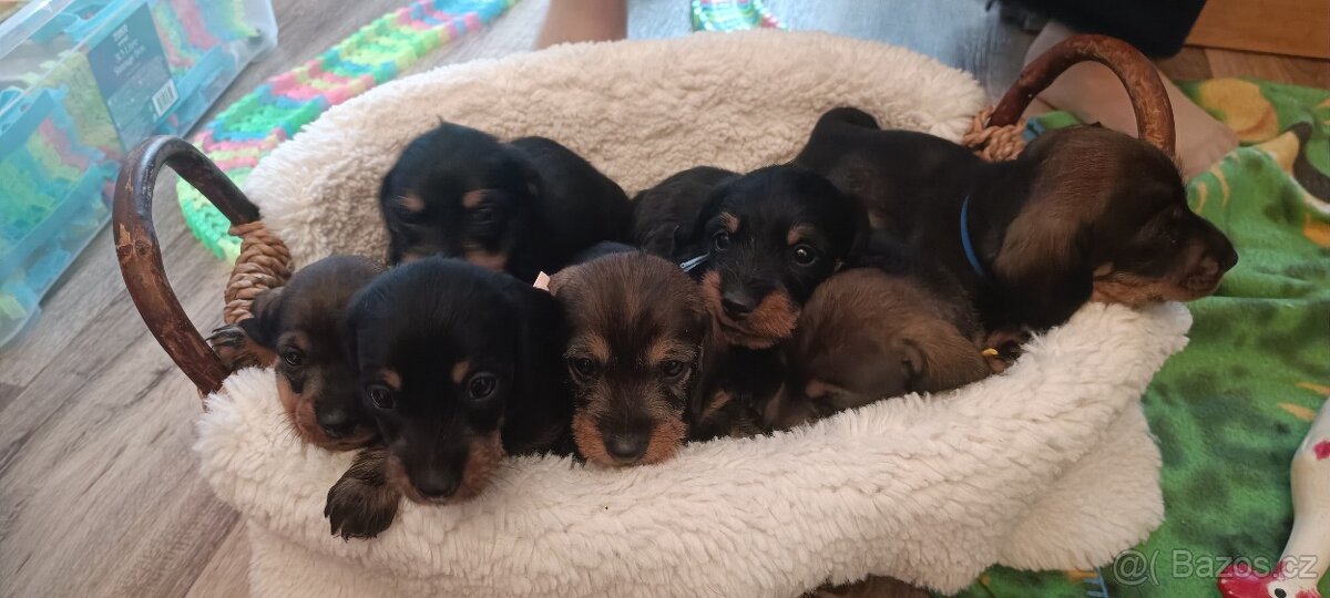 Nabízíme k prodeji štěňátka 4 holčičky a 3 pejsky drsnosrstého trpasličího jezevčíka bez PP. Ke konci března budou k odběru.