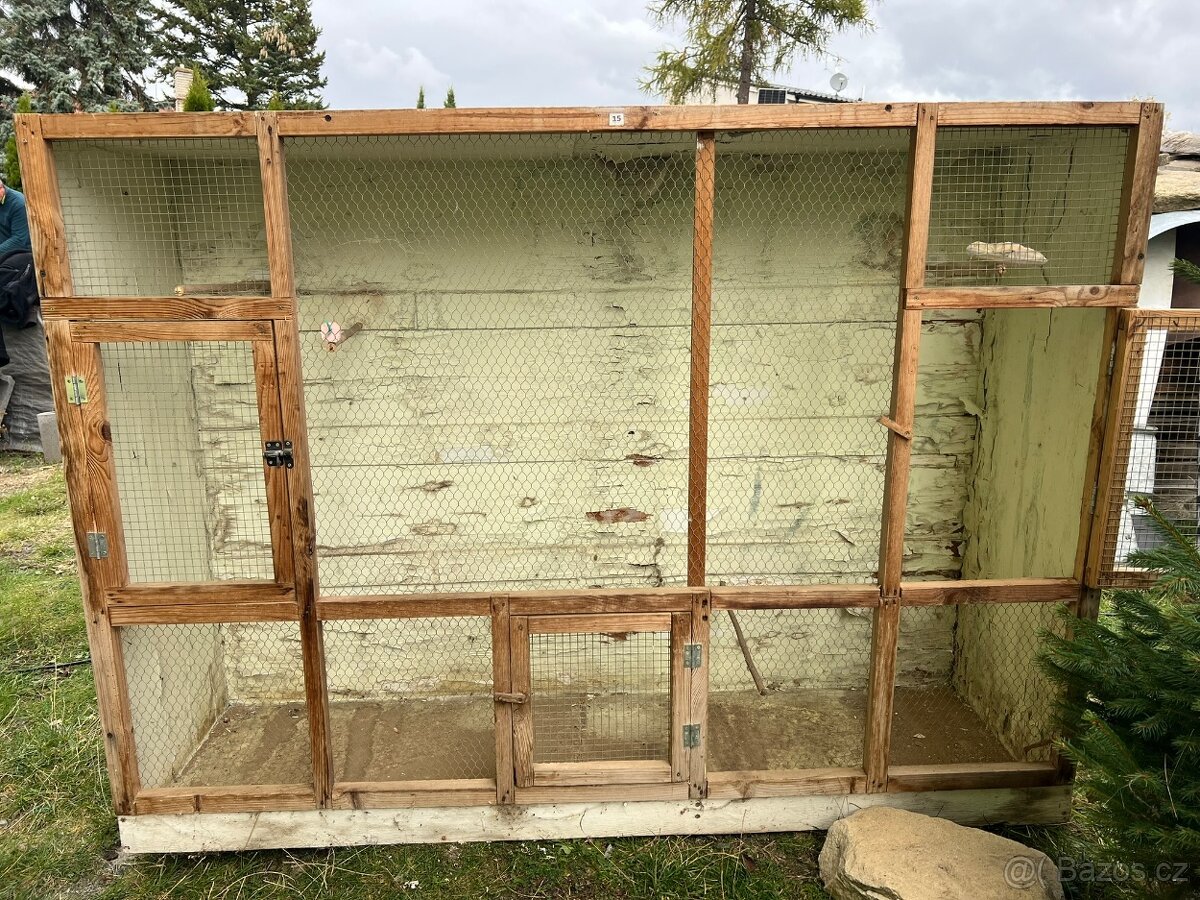 Prodám dřevěnou bednovou klec - voliéru pro ptáky. Rozměry d 166 - v 118 - š 44 cm. Klec je plně funkční, potřeba jen znovu natřít.