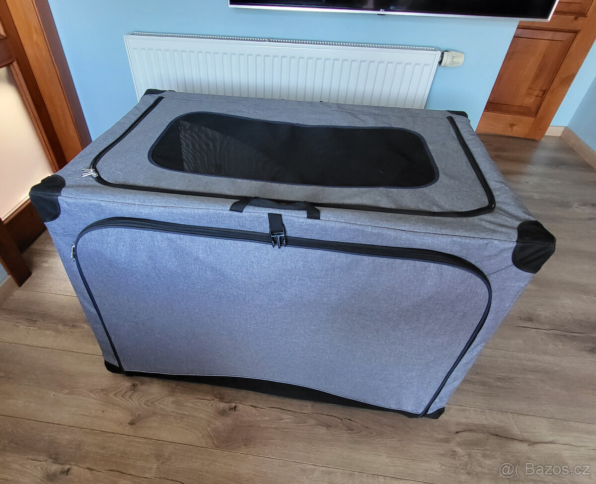 Prodám jednou použitou cestovní skladací nylonovou přepravku pro psy,lehká, pratelná. Rozměry 105x70x70cm.