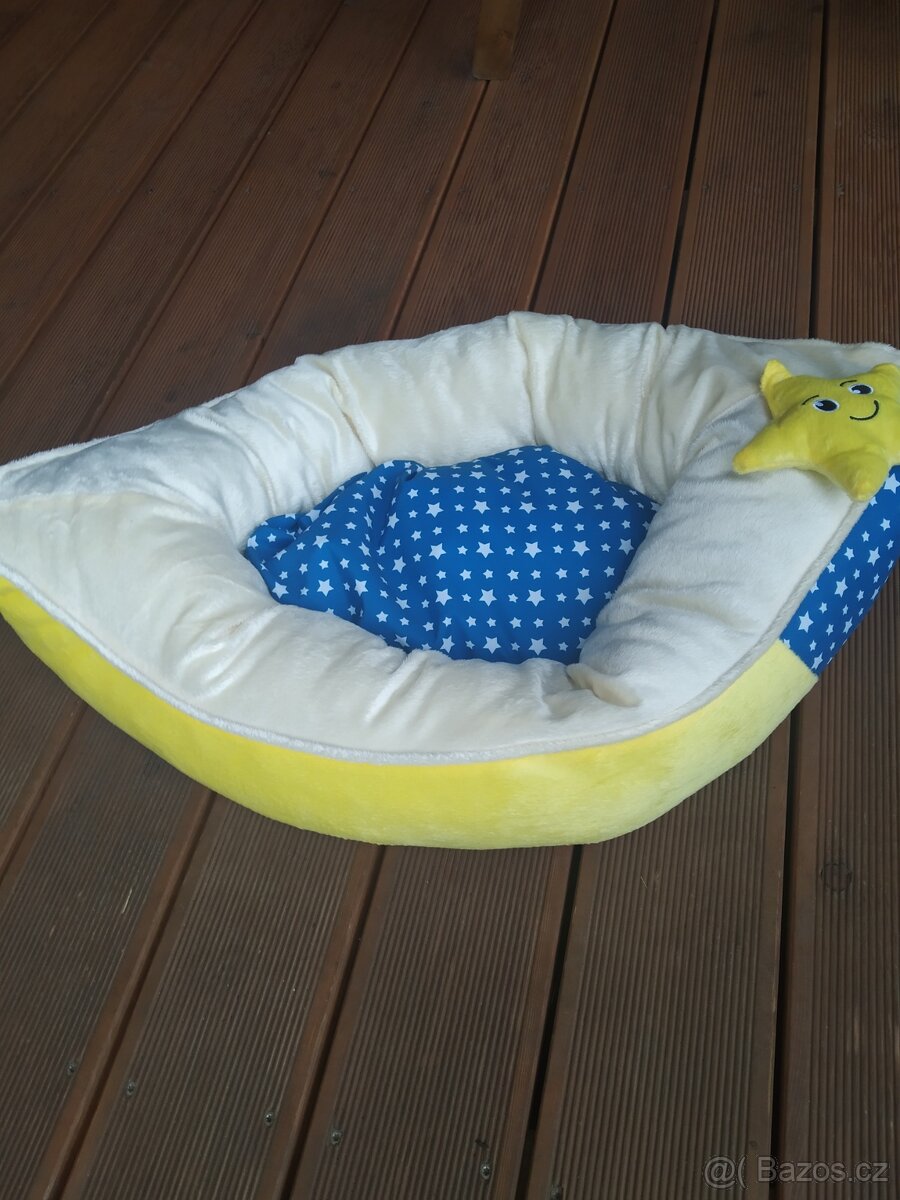 Silný, oboustranný polštář je snímatelný a má teplou plyšovou stranu v krémové barvě a modrou stranu s bílou hvězdou. Hvězdičku najdete i na vnější straně pelíšku. Na straně hlavy půlměsíce je vyšitá malá plyšová hvězda.