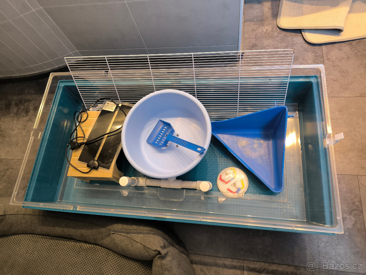 Prodám výbavu pro ježka bělobřichého. Používáno cca 3 roky, takže je to trochu vidět. Klec - Duna Maxi, nikde není prasklá, hřevěný domeček, 2 misky, rohový záchodek, kolotoč, lopatka, výhřevná podložka, více jak půl velkého 42 l pytle Asanu.