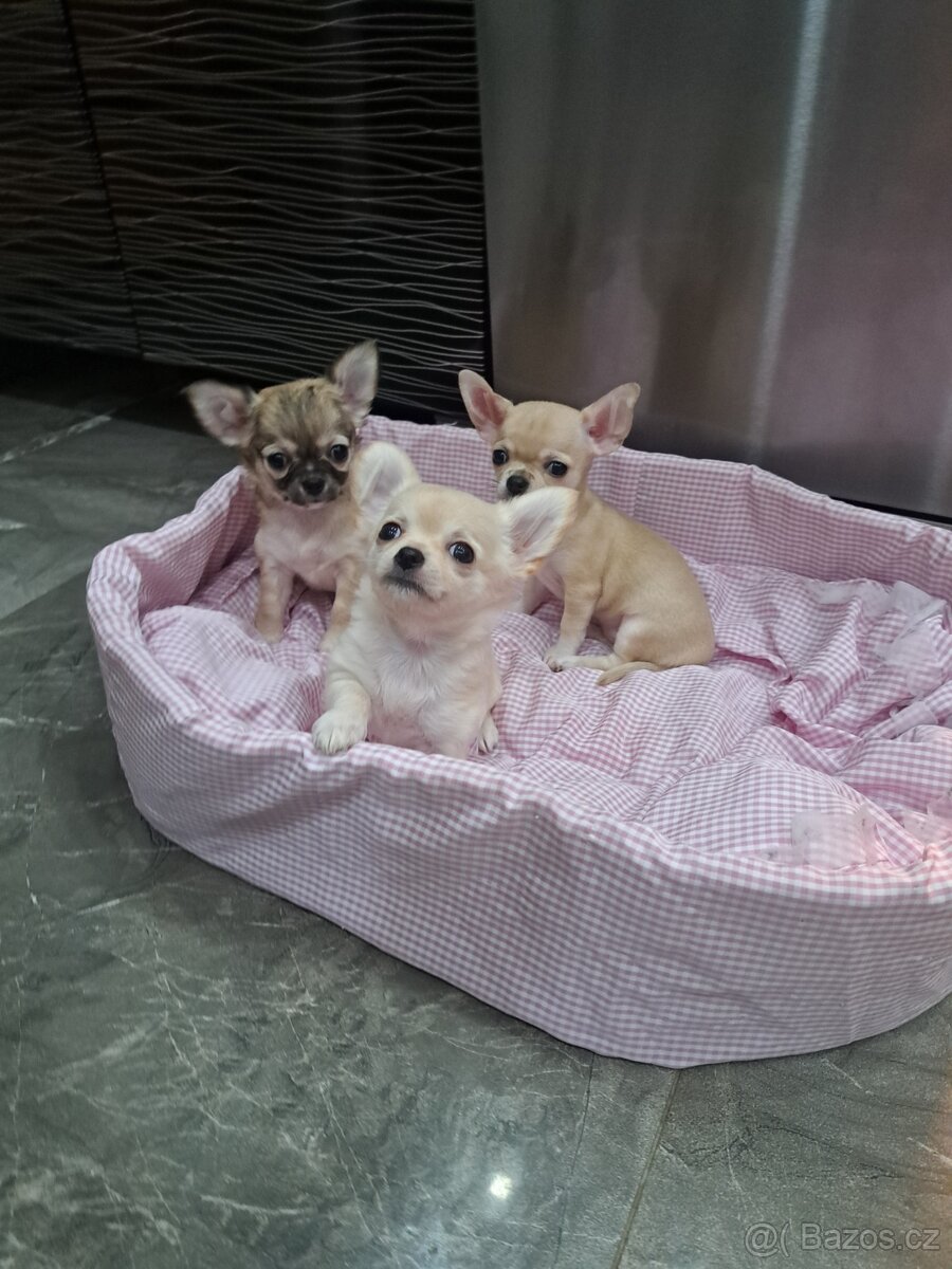 Nabízím krásné, čistokrevné štěňátka čivavy,3 fenečky, mají 8 týdnu v dospělosti budou vážit od 1.5kg - 2 kg, jsou naočkované a několikrát odčervené s čipem, rodiče u nás k vidění, tatínek s pp maminka bez ale čistokrevná, jsou vymazlené a hravé, naučené chodit na plínu, papají granulky Royal canin puppy. Do nového domova dostanou granulky do začátku, očkovací průkaz s čipem, smlouvička je samozřejmostí.