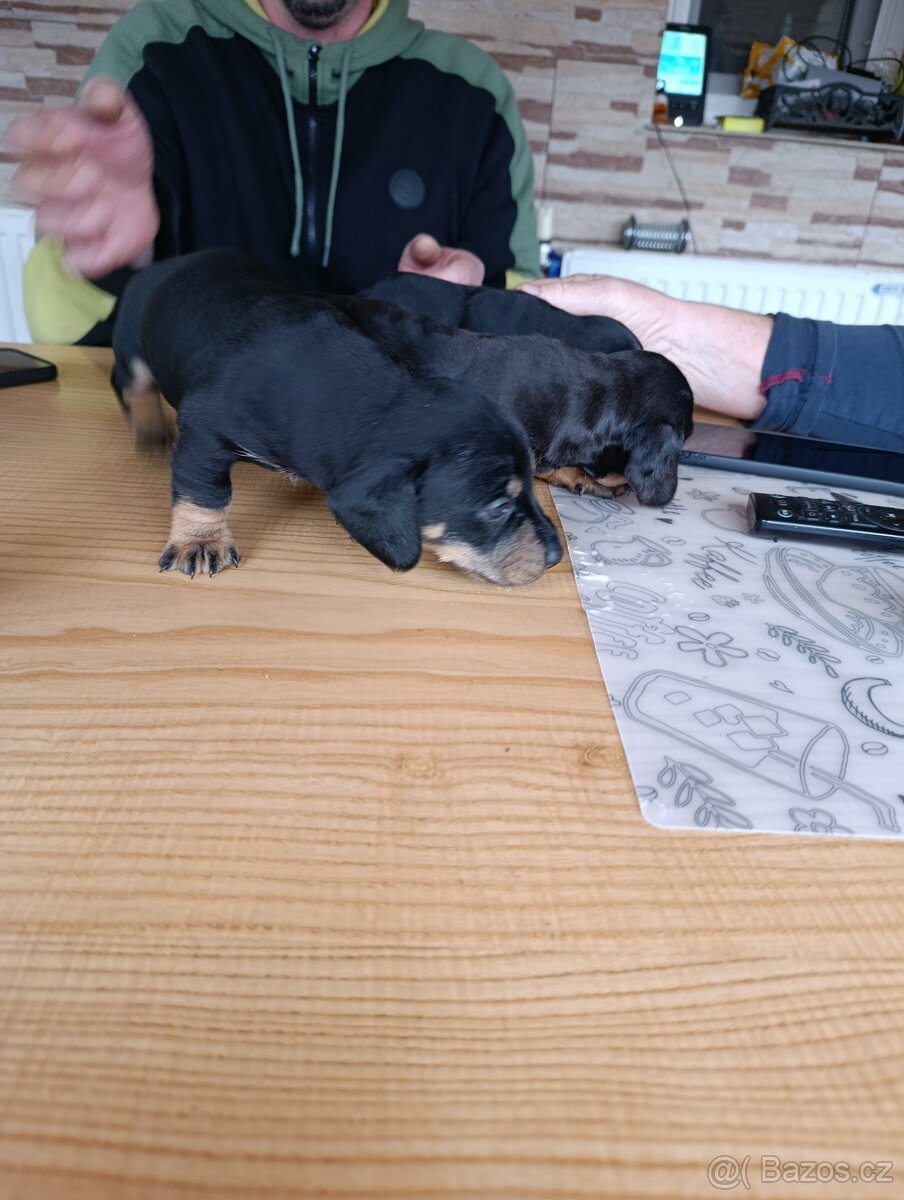 Nabízím dva pejsky a jednu fenku jezevčíků.matka hrubosrsta černá,otec hladkosrstý černý.stenstka budou odčervená, očkovaná a čipovana.odber možný v půlce března .