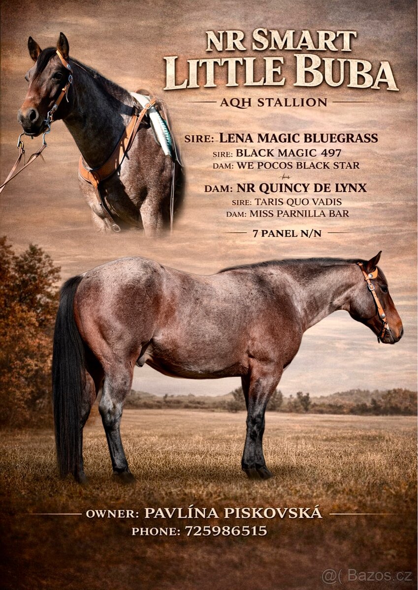 Nabízíme připouštění plemenným hřebcem AQH NR SMART LITTLE BUBA. Hřebec připouští přirozeně v Kružberku, okres Opava, klisny plemen AQH, APH a A1/1. Hřebec se vyznačuje skvělou klidnou povahou a mohutnou stavbou těla, což po něm dědí i jeho potomci.